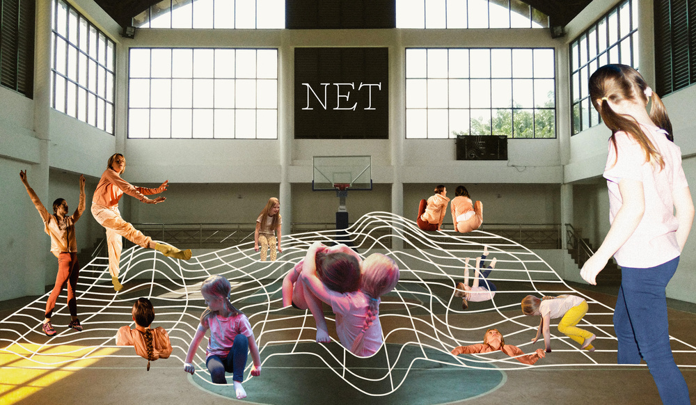 In NET, a web moves in and sprawls across the room. Accompanied by three dancers, we will unravel the performance, as a choreographic kaleidoscope unfolds. Together, we get lost in an undulating landscape of 192 elastic squares, which, with dance as a motor, opens doors to new spaces where our imagination can proliferate. Through catchy beats and melodic loops, we build a shared aesthetic experience together.